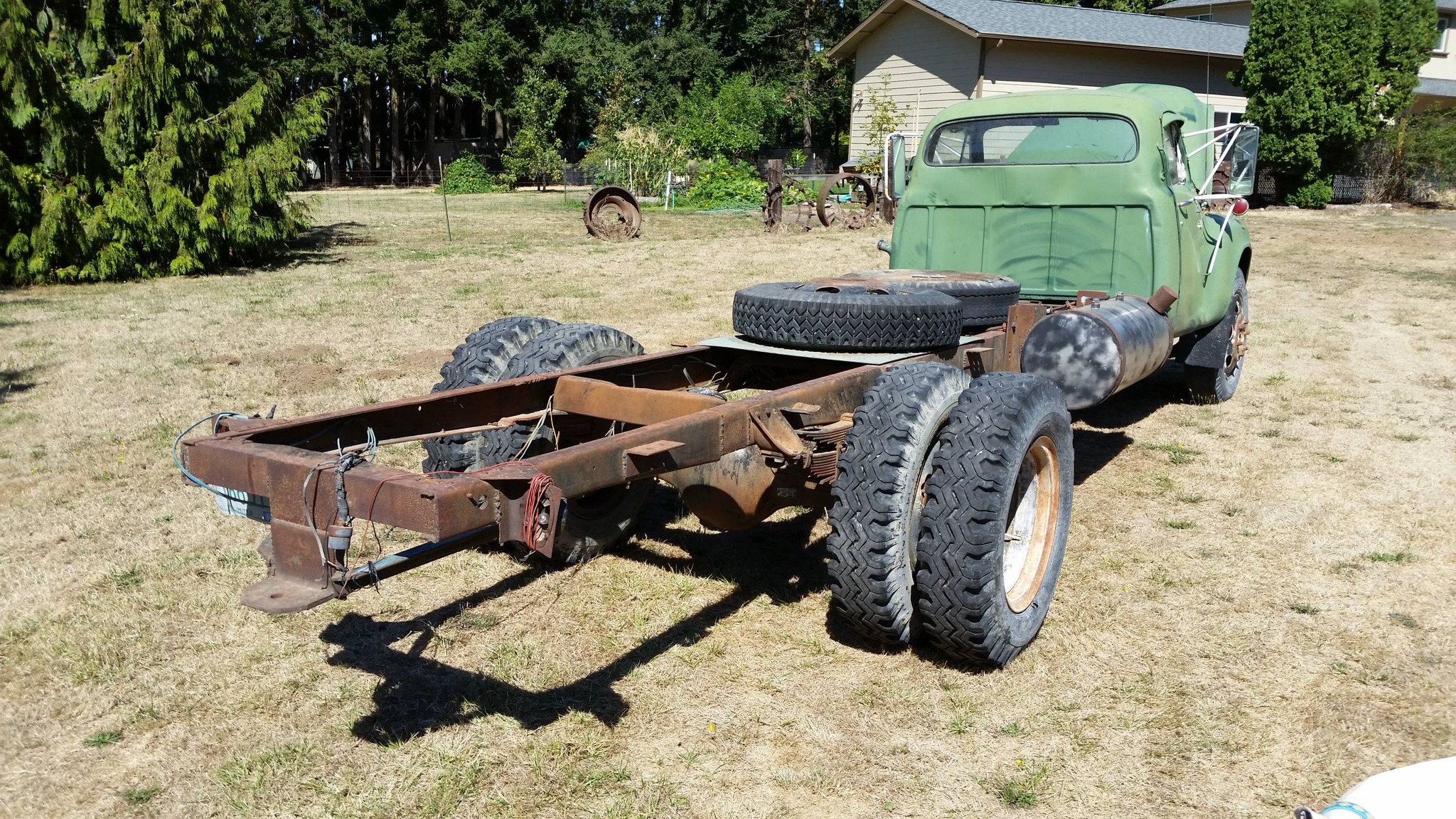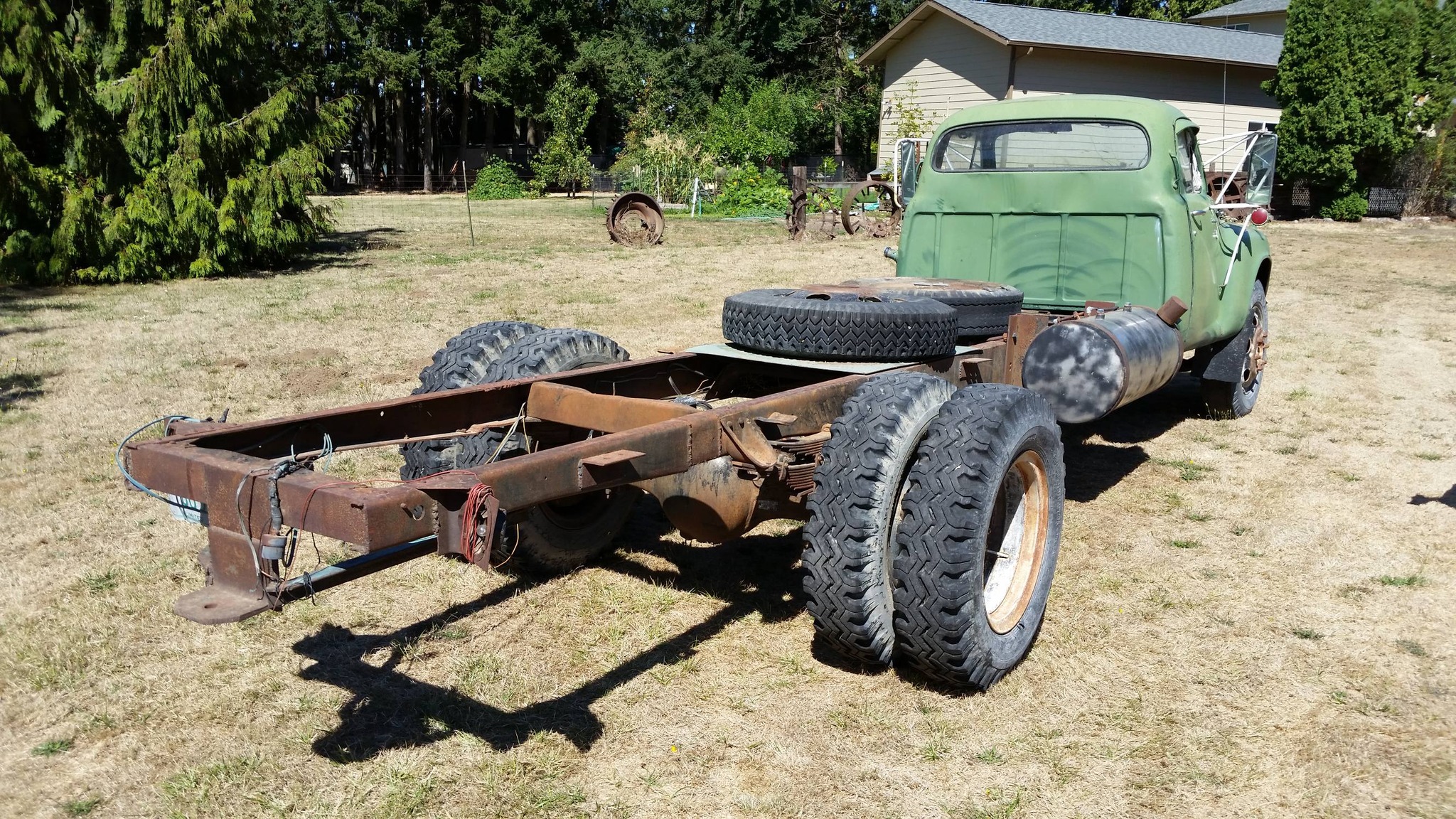 Likely 1950's or 1960's but there is no VIN or license plate so no DMV paperwork is needed. This frame has been sitting outside in Molalla, Oregon for 20 years. A pick-up canopy was over the bed for most of that time and only removed last summer. Currently, the front axle is included but not attached and tires do not roll. A flatbed trailer will be needed to haul the frame.